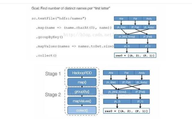 步骤1:创建RDD。上面的例子除去最后一个collect是个动作,不会创建RDD之外,前面四个转换都会创建出新的RDD。因此第一步就是创建好所有RDD(内部的五项信息)。