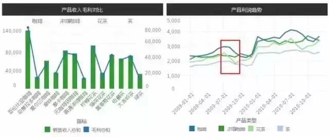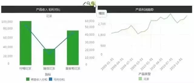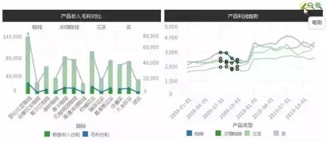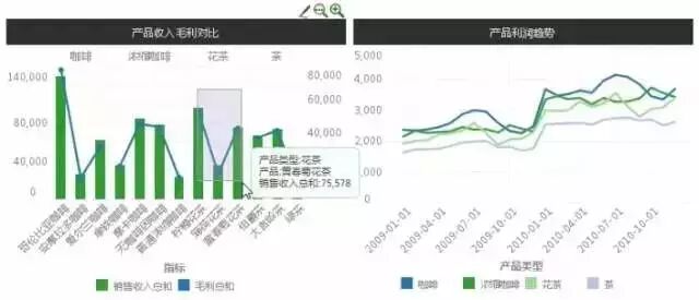 举一个例子,如下图,左图是各产品的收入毛利对比,右图是各品类利润趋势,现在用户想聚焦到“花茶”品类下的三种产品上,看看它们的利润如何。