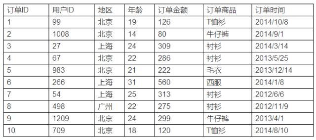 先不管这个数据表是存在excel里还是数据库里,只关注数据本身。表里涉及到的数据项(或者叫字段)有“订单ID”、“用户ID”、“地区”、“年龄”、“订单金额”、“订单商品”、“订单时间”。