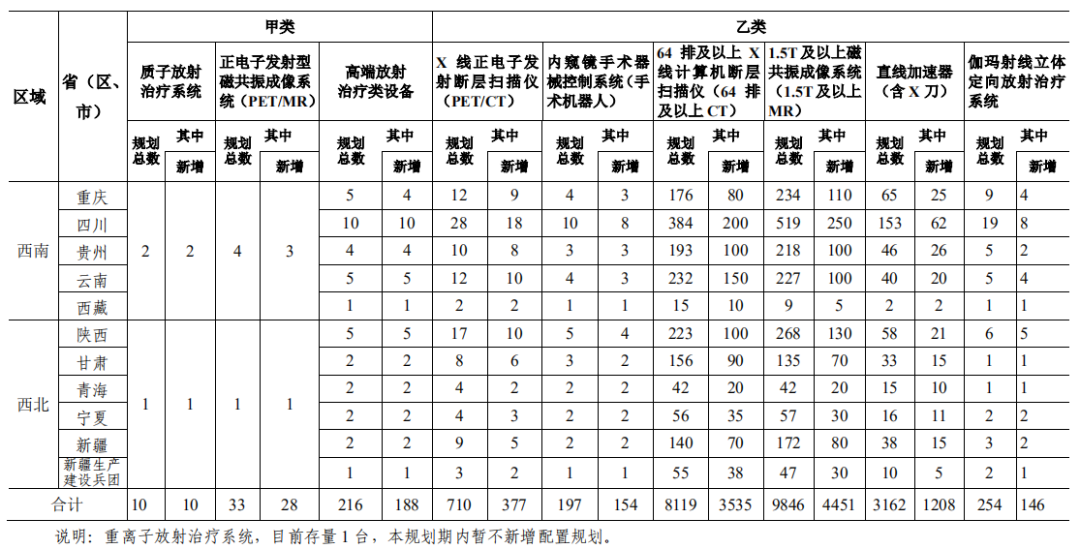 高端放射治疗设备:2018-2020年新增总数不变,还是原来的188台,虽然总数量与调整前没有变化,但华北、东北、华东、中南、西南、西北六大区域及区域内省(区、市)所分配到的台数有所调整。