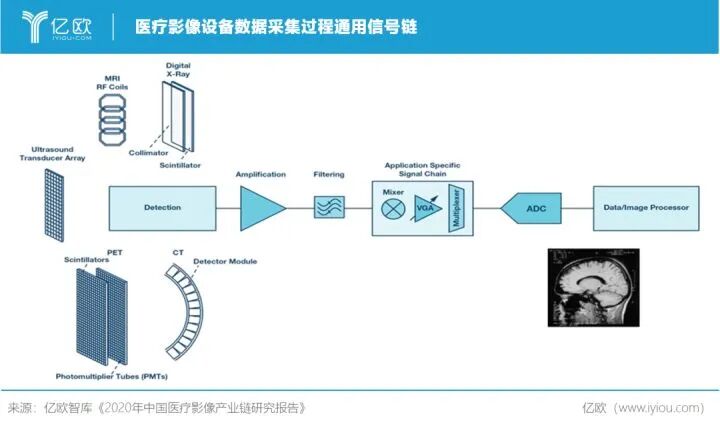 传感元件作为医疗影像领域重要的元器件,是信号发射和接收部分的重要物理部件,按照不同成像领域有不同传感器类别。但其输出信号一般非常弱,需要优化接口电路,在提供足够增益的同时又不会引入噪声,因此信号链在其中扮演重要角色。信号链是从物理信号转成数字信号的关键环节。