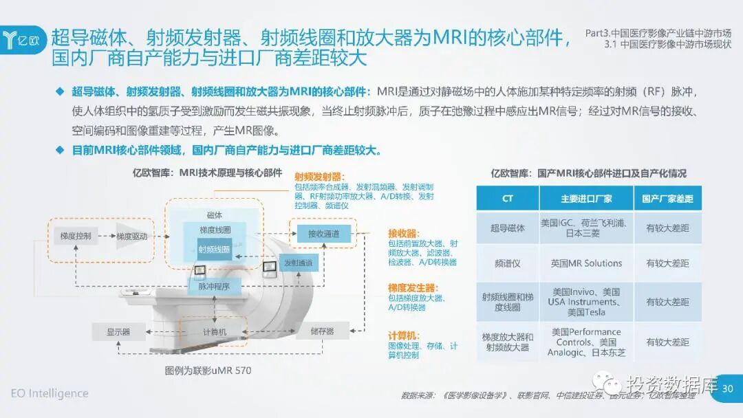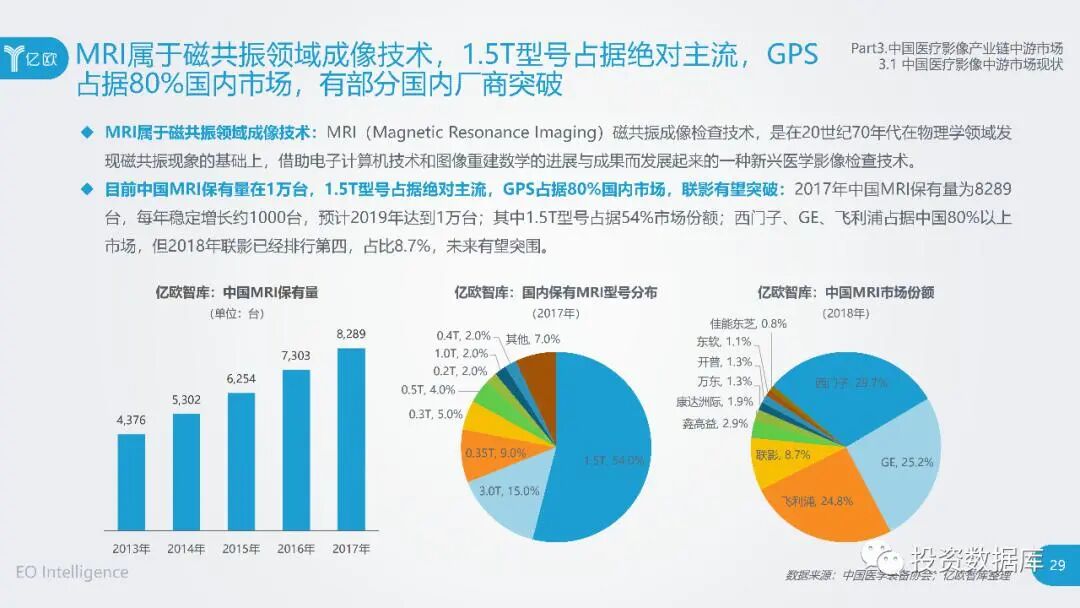 从市场竞争格局来看,GE、飞利浦、西门子三家约占市场总额80%,联影已经排名第四,联影、东软作为国产磁共振代表,在超导核磁共振领域,尤其在1.5T磁共振市场表现突出,其中联影的1.5T超导MRI在2015年的国内市场份额中已经超越部分进口企业,国内外MRI的市场竞争差距还较大。