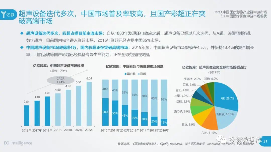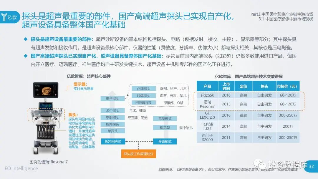 超声中低端领域国产产品已媲美GPS,核心部件如探头和算法已经实现较强自主研发能力,以开立医疗、迈瑞医疗、祥声为代表的国内企业市场份额不断增加,辅以天然的营销优势,超声设备已经具备整体国产化基础,未来将朝着小型化、便携化方向发展。在分级诊疗政策推动下,未来五年,国内彩超将逐步实现国产替代。