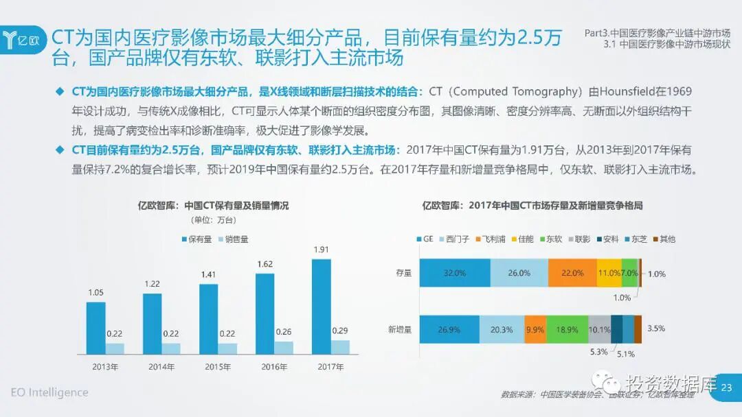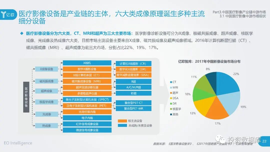目前市场主流影像设备主要来自X成像、磁共振成像及超声成像领域。计算机断层扫描(CT)、磁共振成像(MRI)、超声成像为前三大市场。