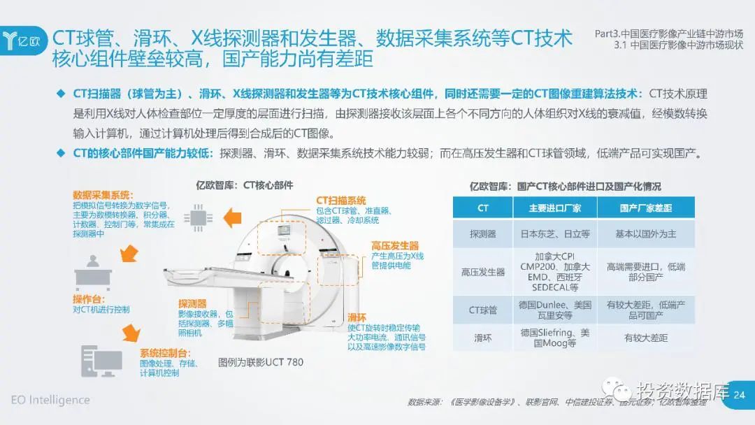 医疗影像产业链可细分为六个环节,分别为原料生产、零部件生产、核心组件制造、主机制造、系统集成和医院。医疗影像上游原材料种类众多,电子元器件、传感元件及材料、结构件为核心组件。