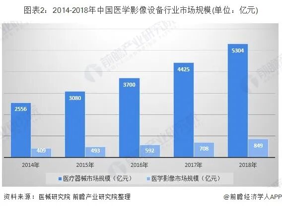中国医疗影像市场规模高达千亿,是医疗器械中最大的细分行业,近五年复合增长率达到6.5%,远超全球1%的增速。目前围绕大型影像器械的主要原创技术已进入静默期,这给绝大部分技术还处于成长期的国内企业带来难得的跟进机遇,未来国产医疗影像将继续沿着由低端向高端进口替代的方向发展,市场潜力巨大。据医械研究院测算,2018年中国医疗器械市场规模约为5304亿元,其中医学影像市场占比为16%,故据此推算,2018年中国医学影像设备行业市场规模约为849亿元。