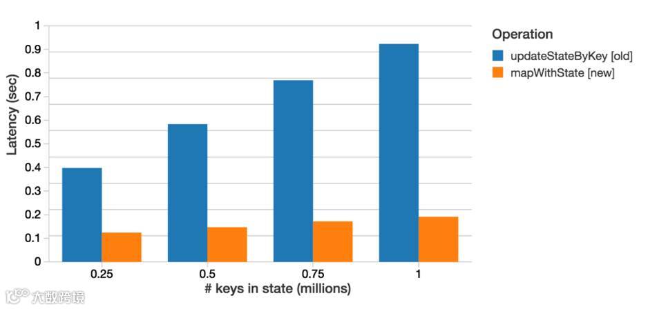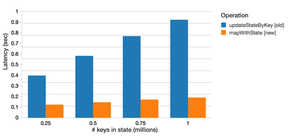 mapWithState方法比updateStateByKey方法的批处理时间(例如延迟)快8倍