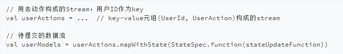然后,在用户动作DStream上定义mapWithState 方法,通过创建StateSpec对象来实现,该对象中包含所有前述指定的操作。
