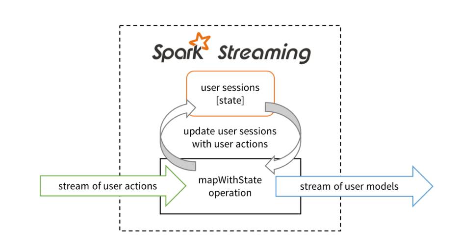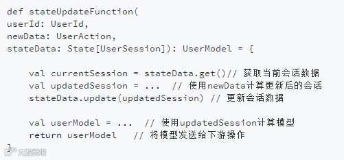 mapWithState方法可以通过下面的抽象方式进行理解,假设它是将用户动作和当前用户会话作为输入的一个算子(operator),基于某个输入动作,该算子能够有选择地更新用户会话,然后输出更新后的用户模型作为下游操作的输入。开发人员在定义mapWithState方法时可以指定该更新函数。