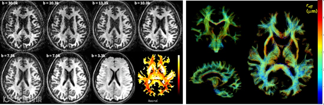 微脑解析:基于SIGNA MAGNUS平台,高梯度场强切换率性能下,使用超高30000B值弥散成像,大幅剔除小轴突测量中不同伪影因素的影响,成功对微脑损伤患者进行了1μm及以下的轴突直径进行解析显示,为微脑的损伤以及机制研究带来全新的临床研究尺度。