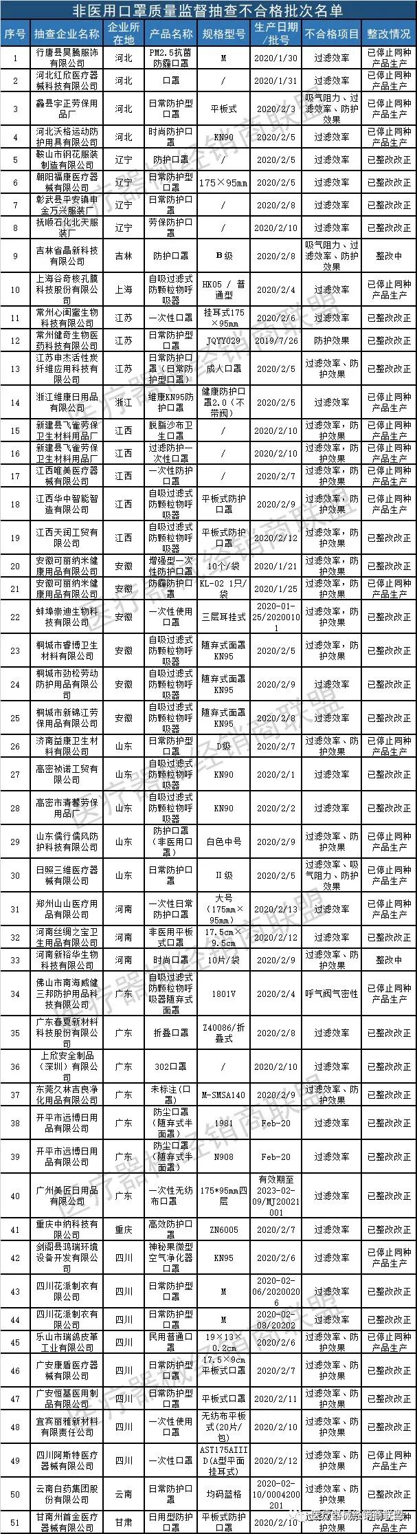 而就在4月27日,市场监管总局也公示了47家企业的51批次不合格非医用口罩产品“黑名单”。