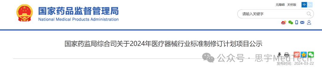 3月22日,国家药监局网站发布《国家药监局综合司关于2024年医疗器械行业标准制修订计划项目公示》。