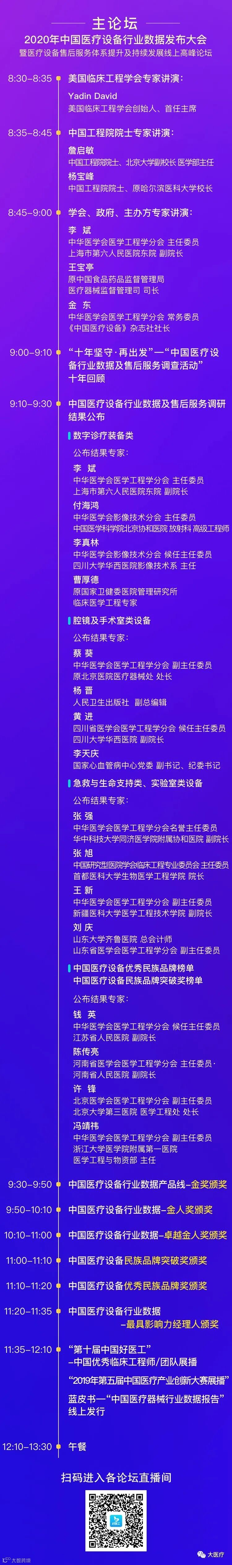 本次大会特设“一大主论坛”,将通过好医工app线上直播平台,在国家相关政策法规部委、全国临床及临床工程领域行业专家、医疗领域“大数据”专家,及来自全球的顶尖医疗设备领先企业及全面医工同仁的共同见证下全国首发“2019年中国医疗设备行业数据及售后服务满意度调研”结果——《2019年度中国医疗设备行业数据全国报告》。