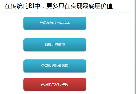 在之前的传统BI可能因为这些因素,所以没有达到今天的数据在高度,可能是互联网本身发展的因素,数据对于互联网企业价值。但其中有一个很大的因素,可能是传统的BI,更多是偏重数据仓库的架构,根据需求来帮报表。在数据部门没有一批主动去思考业务,思考业务与数据关系的人。这种人很可能都是在业务方,他们更多把业务问题转为要看的报表,然后与数据部门沟通报表开发,数据部门收集需求沟通后,进行排期,进入比较慢长的等待期。
