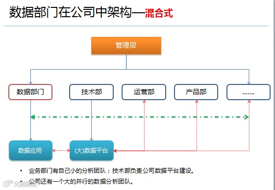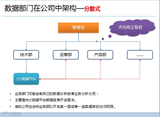 在一个企业中,可能数据部门在一个公司中组织架构中的位置,决定了部门的定位和一些做的事情,所以个人认为数据部门所处的组织架构对数据价值实现是一个很重要因素。这也是今天我也来谈一谈的主题。