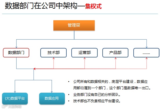 就是公司所有的数据相关都归到一个部门中。业务方任何有需要都会向数据部门提出,数据部门会在内部对这些需求和报表进行沟通,避免重复开发,也便于对需求进行总结。