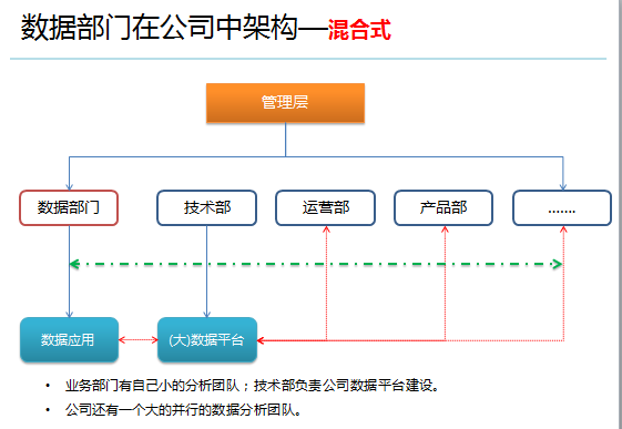有一个比较大的数据部门,负责数据分析,挖掘,数据统一工作。一般来说这个部门会直接像管理层汇报,主要服务公司管理层;同时也会和业务方的数据分析师合作一起解决某个具体问题。