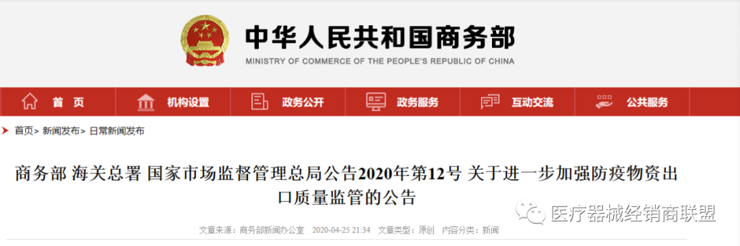 4月25日晚间,商务部、海关总署、国家市场监督管理总局三部门再次联合发布了《关于进一步加强防疫物资出口质量监管的公告(2020年第12号)》(以下简称《公告》)。