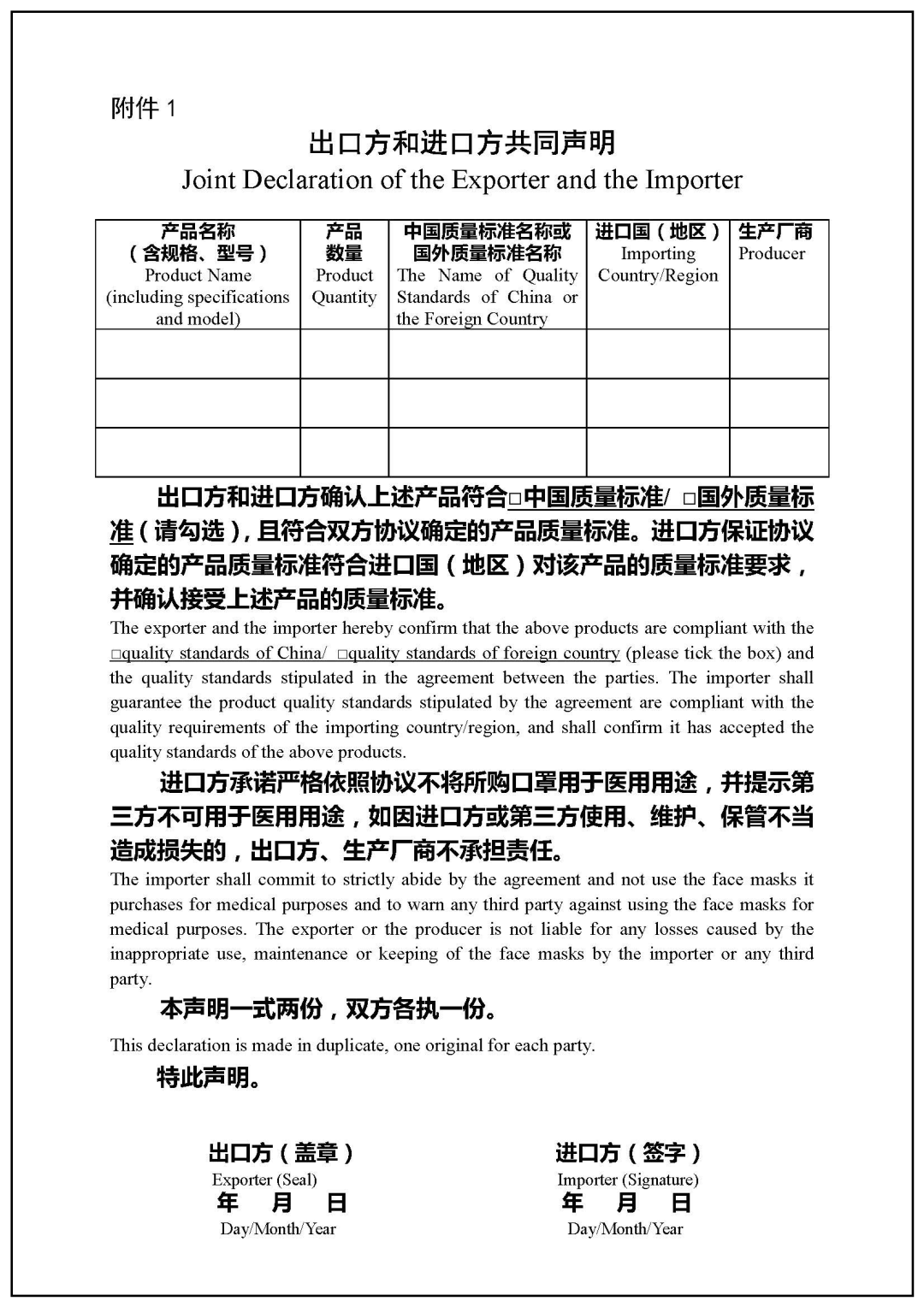 非医用口罩出口企业报关时须提交电子或书面的出口方和进口方共同声明(参考附件1),确认产品符合中国质量标准或国外质量标准,进口方接受所购产品质量标准且不用于医用用途。