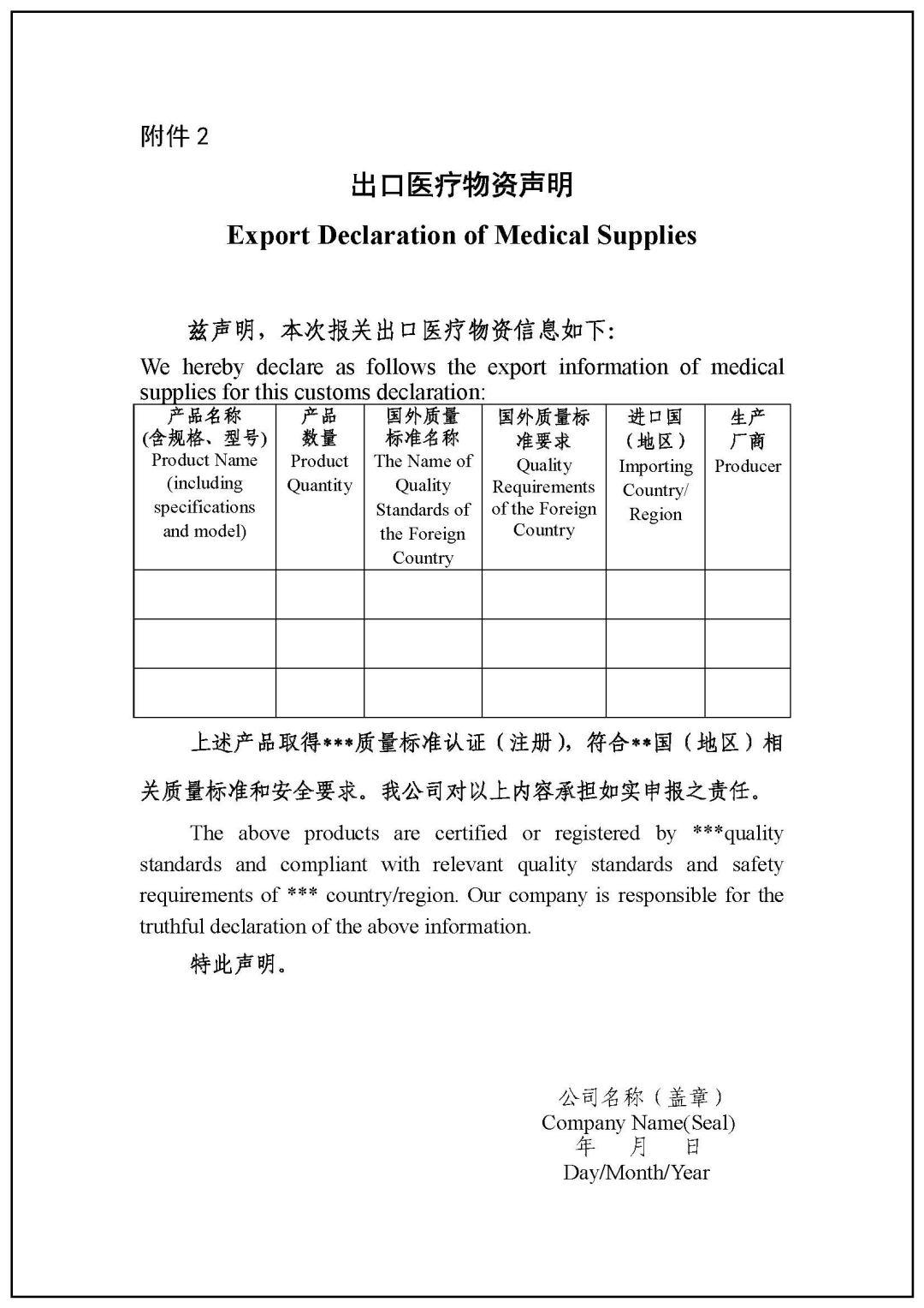 此外,三部门还明确,自4月26日起,产品取得国外标准认证或注册的新型冠状病毒检测试剂、医用口罩、医用防护服、呼吸机、红外体温计的出口企业,报关时须提交书面声明(参考附件2),承诺产品符合进口国(地区)质量标准和安全要求,海关凭商务部提供的取得国外标准认证或注册的生产企业清单(中国医药保健品进出口商会网站www.cccmhpie.org.cn动态更新)验放。