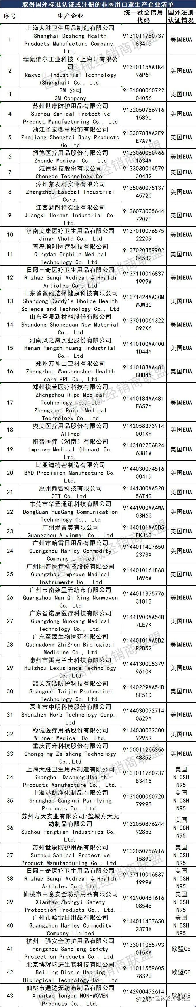取得国外标准认证或注册的非医用口罩生产企业清单
