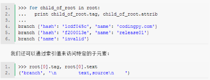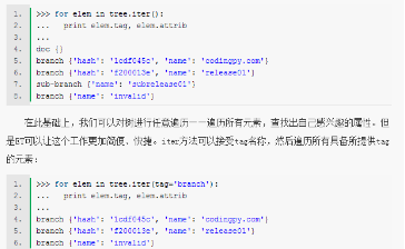 >>> for elem in tree.iterfind('branch[@name="release01"]'): ... printelem.tag, elem.attrib ... branch {'hash': 'f200013e', 'name': 'release01'}