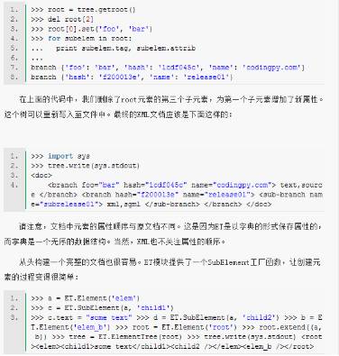 Python标准库中,提供了ET的两种实现。一个是纯Python实现的xml.etree.ElementTree,另一个是速度更快的C语言实现xml.etree.cElementTree。请记住始终使用C语言实现,因为它的速度要快很多,而且内存消耗也要少很多。如果你所使用的Python版本中没有cElementTree所需的加速模块,你可以这样导入模块: