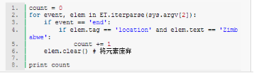 上面的for循环会遍历iterparse事件,首先检查事件是否为end,然后判断元素的tag是否为location,以及其文本值是否符合目标值。另外,调用elem.clear()非常关键:因为iterparse仍然会生成一个树,只是循序生成的而已。废弃掉不需要的元素,就相当于废弃了整个树,释放出系统分配的内存。