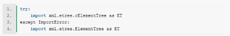 如果某个API存在不同的实现,上面是常见的导入方式。当然,很可能你直接导入第一个模块时,并不会出现问题。请注意,自Python 3.3之后,就不用采用上面的导入方法,因为ElemenTree模块会自动优先使用C加速器,如果不存在C实现,则会使用Python实现。因此,使用Python 3.3+的朋友,只需要import xml.etree.ElementTree即可。