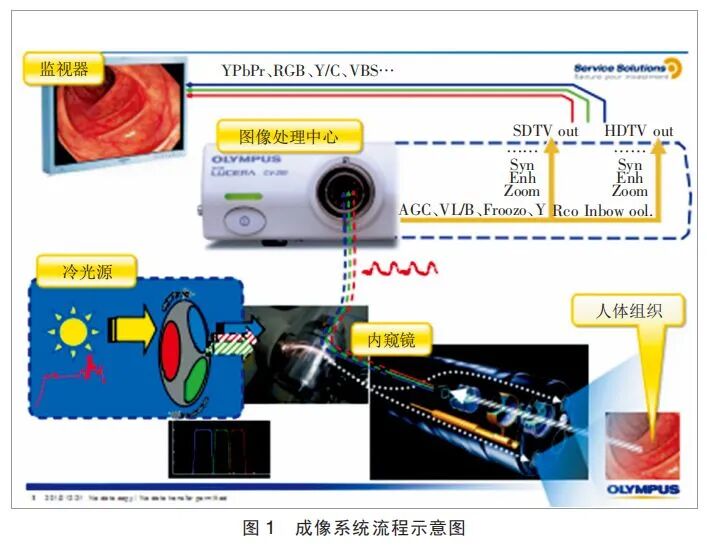 (1)根据成像系统流程示意图(如图 1 所示),按照由易到难的原则,首先查看主机、监视器 YPbPr/RGB 设定是否一致,排查是否为电子内镜电荷耦合元件(charge-coupled device,CCD)损坏导致的现象。更换一个在其他主机上使用正常的内镜,调节 CCD自动白平衡后故障依旧。