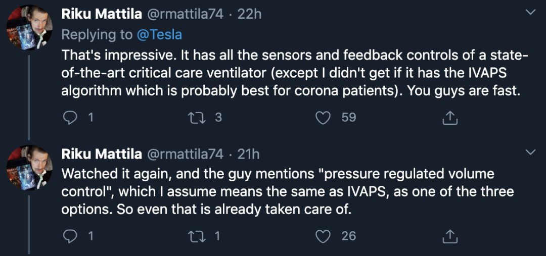 许多人为特斯拉的速度点赞:这些工作让人印象深刻,原型机具备了最先进的重症监护呼吸机所需的所有传感器和反馈控制。你们的速度可真快!