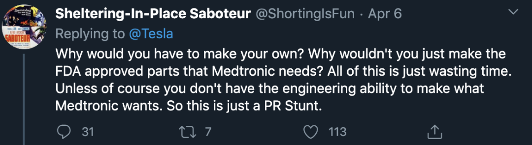 而采用特斯拉零件/基础设施来设计呼吸机的做法,更是赢得了赞同。不过,仍然有人质疑,觉得特斯拉不帮忙生产美敦力这样专业呼吸机制造商需要的零件,而是自己造呼吸机,根本就是在浪费时间。当然,此时此刻,更多网友对这种批评愤而怒怼:键盘侠!