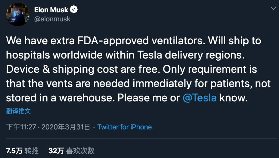 从上个月开始,特斯拉要造呼吸机的事情便已经传得沸沸扬扬了。