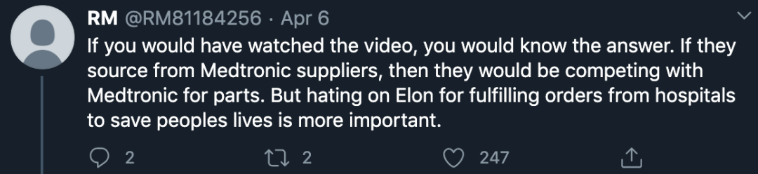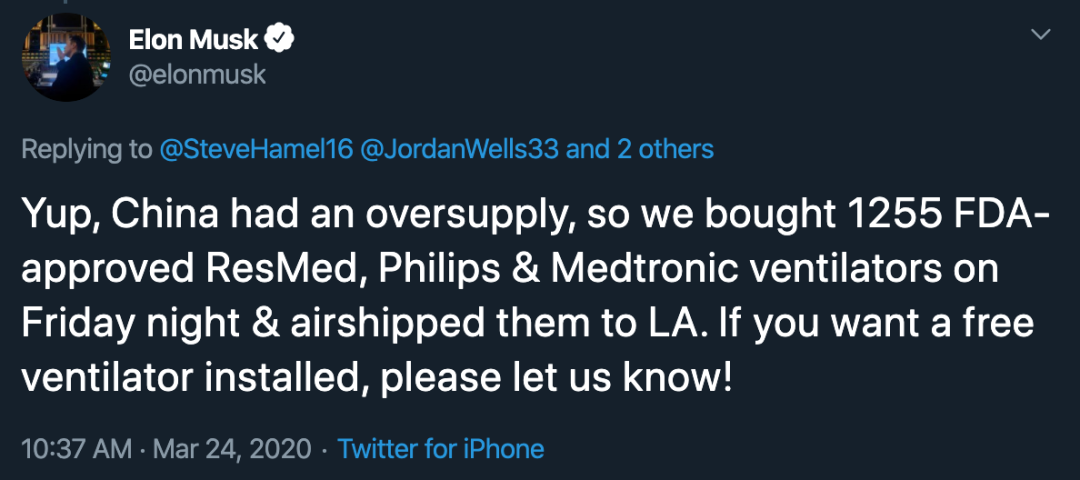 但面对呼吸机严重紧缺的现状,马斯克当时率先采取的措施是从中国采购一批呼吸机:是的,中国市场供应过剩,所以我们在周五购买了1255台FDA认证的ResMed、飞利浦和美敦力呼吸机,并将空运到洛杉矶。而拿到这批呼吸机后,马斯克拿出了1000台提供给了疫情较重的地区,剩下的就拿来做研制。