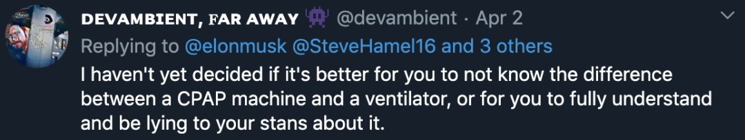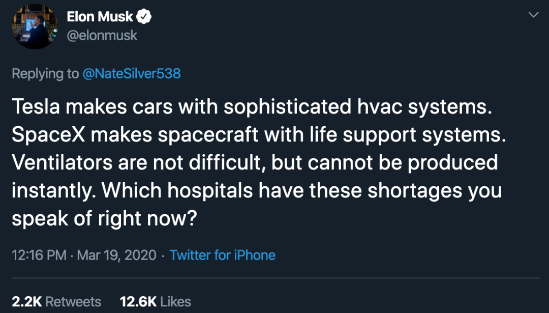 在3月19日的一则推特中,马斯克首次表达了这个想法。他关注到疫情中的呼吸机的短缺,放话说,如果特斯拉要造呼吸机并不是一件难事:特斯拉制造的汽车有先进的暖通系统,SpaceX公司制造的航天器有生命支持系统。呼吸机并不难,但不能马上生产出来。