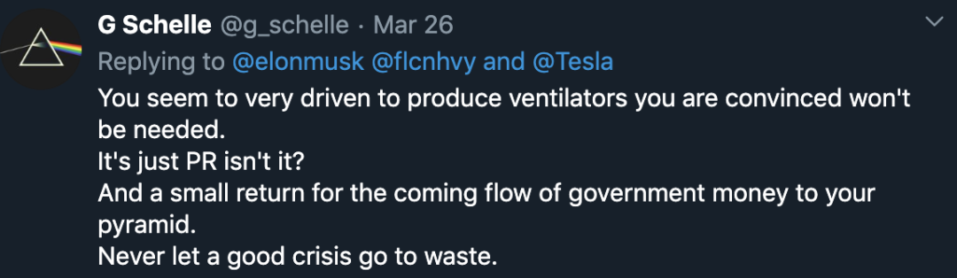 之前,在马斯克刚刚透露特斯拉将造呼吸机的时候,网上质疑声一片。鉴于马斯克之前对新冠病毒大流行“轻描淡写”的反应,和试图维持特斯拉加利福尼亚工厂开放的举动,有人认为马斯克有此表示完全是公关炒作套路。
