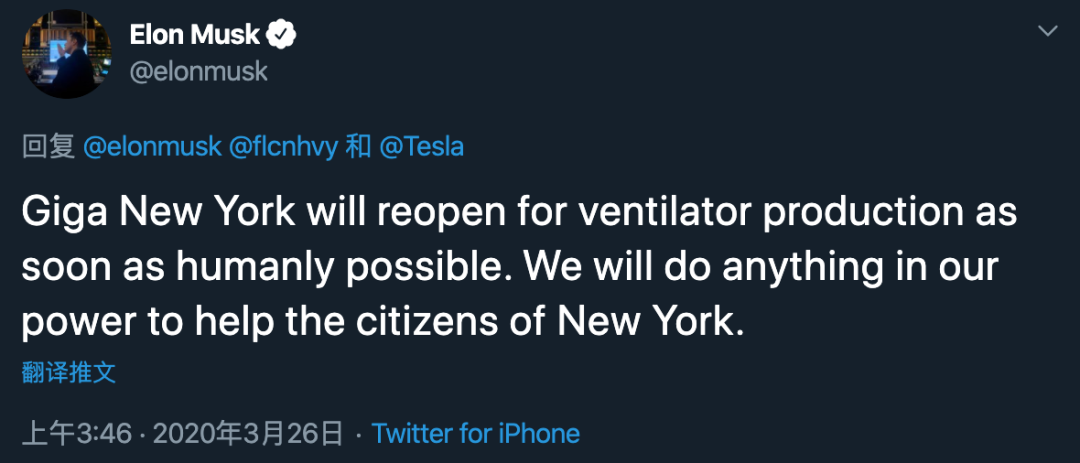 这也让吃瓜网友有了话头,觉得马斯克吹牛了,说自己能造,最后竟然从中国进口。于是26日,马斯克发布推特表示将重启纽约超级工厂,对工厂和生产线进行改造后,将为纽约州新冠肺炎患者生产呼吸机设备。