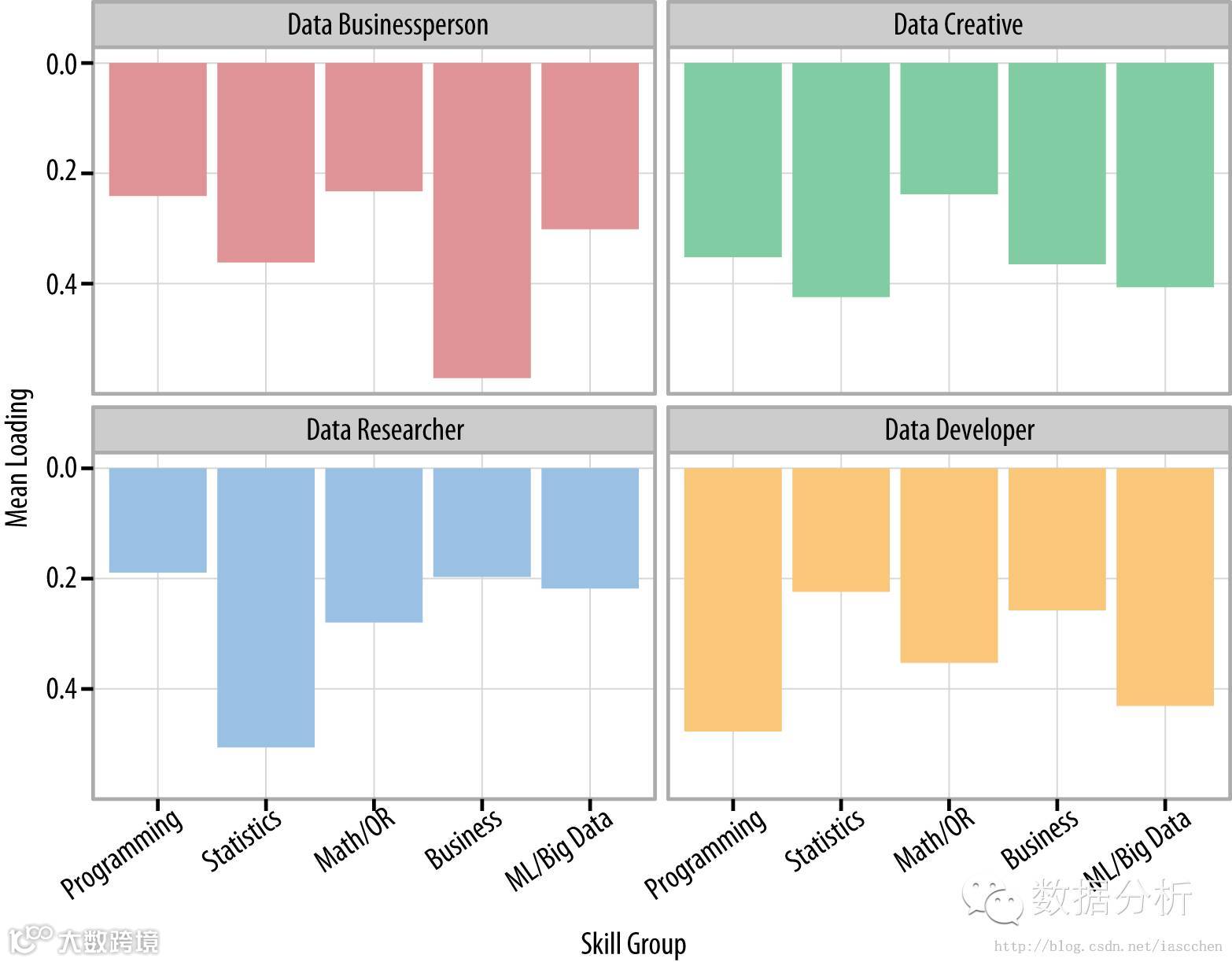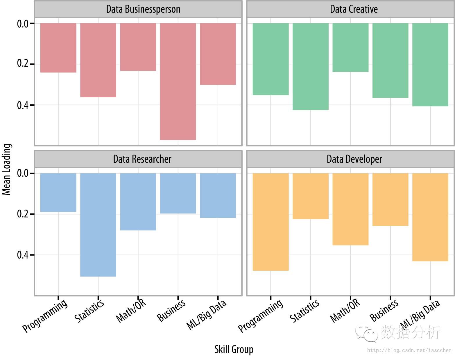 Data Businesspeople 具有顶级的商业能力,其他能力较弱。Data Researcher 往往具有非常深的统计相关技能,但一般说来,他们对于机器学习/大数据,商业,和编程技巧却相对低。Data Developer的模式可以被称为“π形”,拥有强大的编程技巧,较强的机器学习/大数据相关技能,而其他三个技能相对中庸。最后,Data Creative 是不像T形结构的,所有技能相对平均,既不最强,也不最弱。