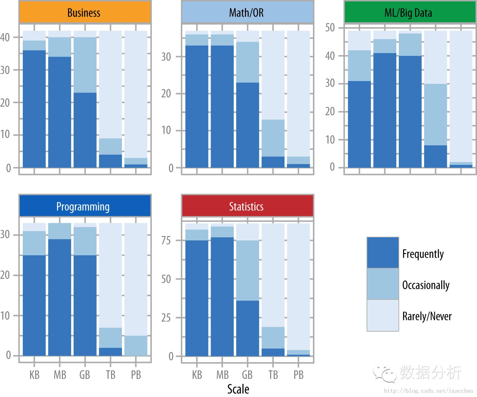 下图描述了对于不同数量级数据集处理的调查结果:大多数数据科学家很少直接操作 TB 级以上的数据。