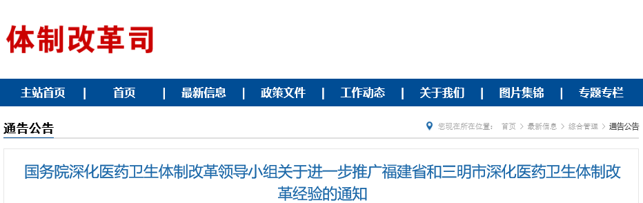 而国务院医改领导小组也紧接着发布了《关于进一步推广福建省和三明市深化医药卫生体制改革经验的通知》。要求全国各省市“进一步推广福建省和三明市医改经验的重点任务”。其中明确要求: