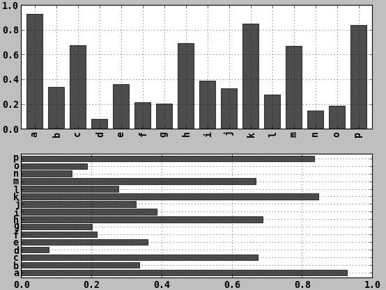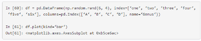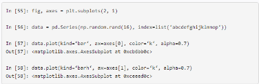 在生成线型图的代码中加上kind=‘bar‘(垂直柱状图)或kind=‘barh‘(水平柱状图)即可生成柱状图。这时,Series和DataFrame的索引将会被用作X(bar)或Y(barh)刻度,如下所示: