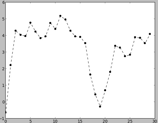 线型图还可以加上一些标记(marker),以强调实际的数据点。由于matplotlib创建的是连续的线型图(点与点之间插值),因此有时可能不太容易看出真实数据点的位置。标记也可以放到格式字符串中,但标记类型和线型必须放在颜色后面。
