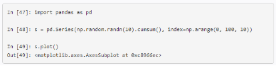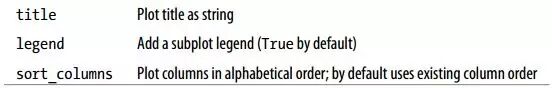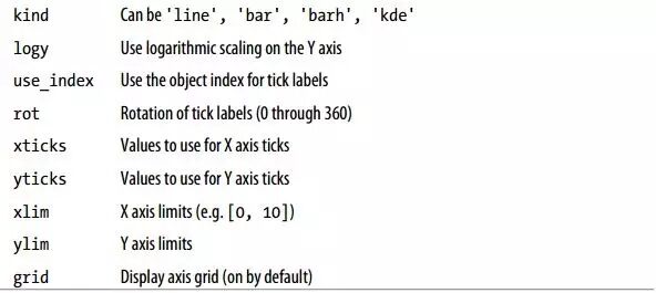 该Series对象的索引会被传给matplotlib,并用以绘制X轴。可以通过use_index=False禁用该功能。X轴的刻度和界限可以通过xticks和xlim选项进行调节,Y轴就用yticks和ylim。plot参数的完整列表如下所示: