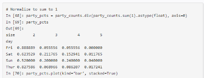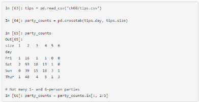 以小费数据集为例,假设我们想要做一张堆积柱状图以展示每天各种聚会规模的数据点的百分比。我用read_csv将数据加载进来,然后根据日期和聚会规模创建一张交叉表: