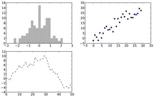 “k--”是一个线型选项,用于告诉matplotlib绘制黑色虚线图。上面那些由fig.add_subplot所返回的对象是AxesSubplot对象,直接调用它们的实例方法就可以在其他空着的格子里面画图了,如下所示: