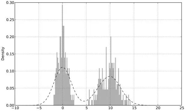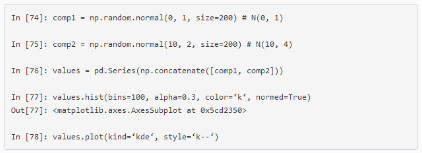 这两种图表常常会被画在一起。直方图以规格化形式给出(以便给出面元化密度),然后再在其上绘制核密度估计。接下来来看一个由两个不同的标准正态分布组成的双峰分布,如下所示: