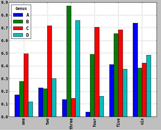 DataFrame各列的名称“Genus”被用作了图例的标题。设置stacked=True即可为DataFrame生成堆积柱状图,这样每行的值就会被堆积在一起,如下所示: