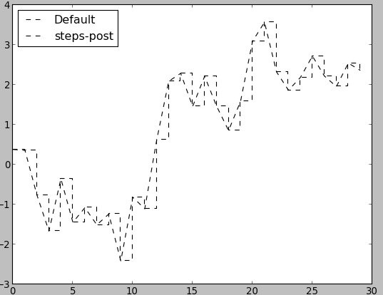 在线型图中,非实际数据点默认是按线性方式插值的。可以通过drawstyle选项修改: