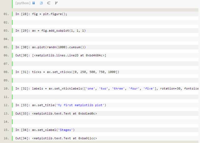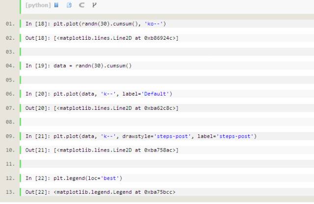 对于大多数的图表装饰项,其主要实现方式有二:使用过程型的pyplot接口以及更为面向对象的原生matplotlib API。pyplot接口的设计目的就是交互式作用,含有诸如xlim、xticks和xticklabels之类的方法。它们分别控制图表的范围、刻度位置、刻度标签等。其使用方式有以下两种: