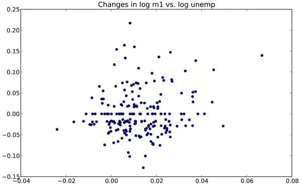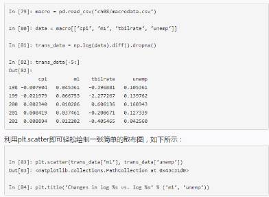 散布图(scatter plot)是观察两个一维数组序列之间的关系的有效手段。matplotlib的scatter方法是绘制散布图的主要方法。在下面这个例子中,我加载了来自statsmodels项目的macrodata数据集,选择其中几列,然后计算对数差: